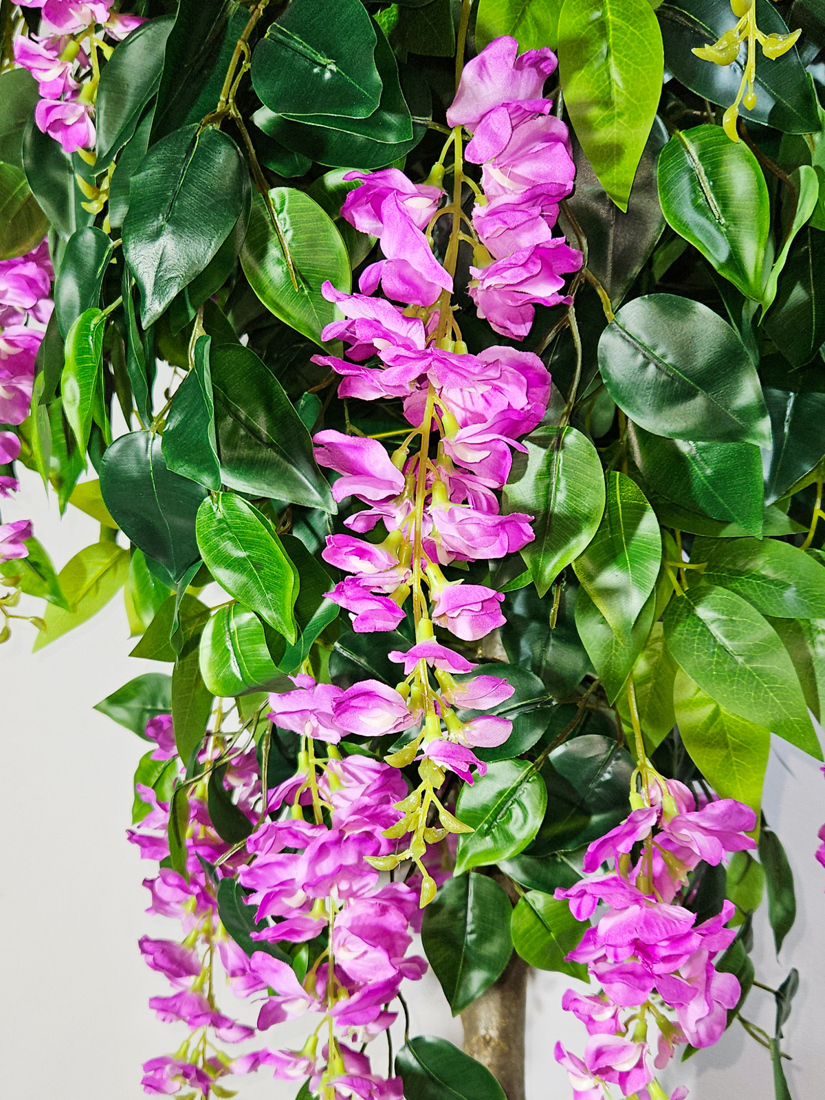 Искусственная глициния в горшке добавит нотку романтики и изящества в ваш интерьер. Ее длинные ветви, украшенные ажурными цветами, придадут особый шарм и уют вашему дому. Благодаря использованию высококачественных материалов, эта красивая глициния выглядит настолько реалистично, что ее легко можно спутать с настоящей. Декоративное высокое дерево в горшке подойдет для оформления лестничного пролета, это оригинальный декор торгового зала, выставки, входной зоны. Дерево можно поставить в свое высокое напольное кашпо.