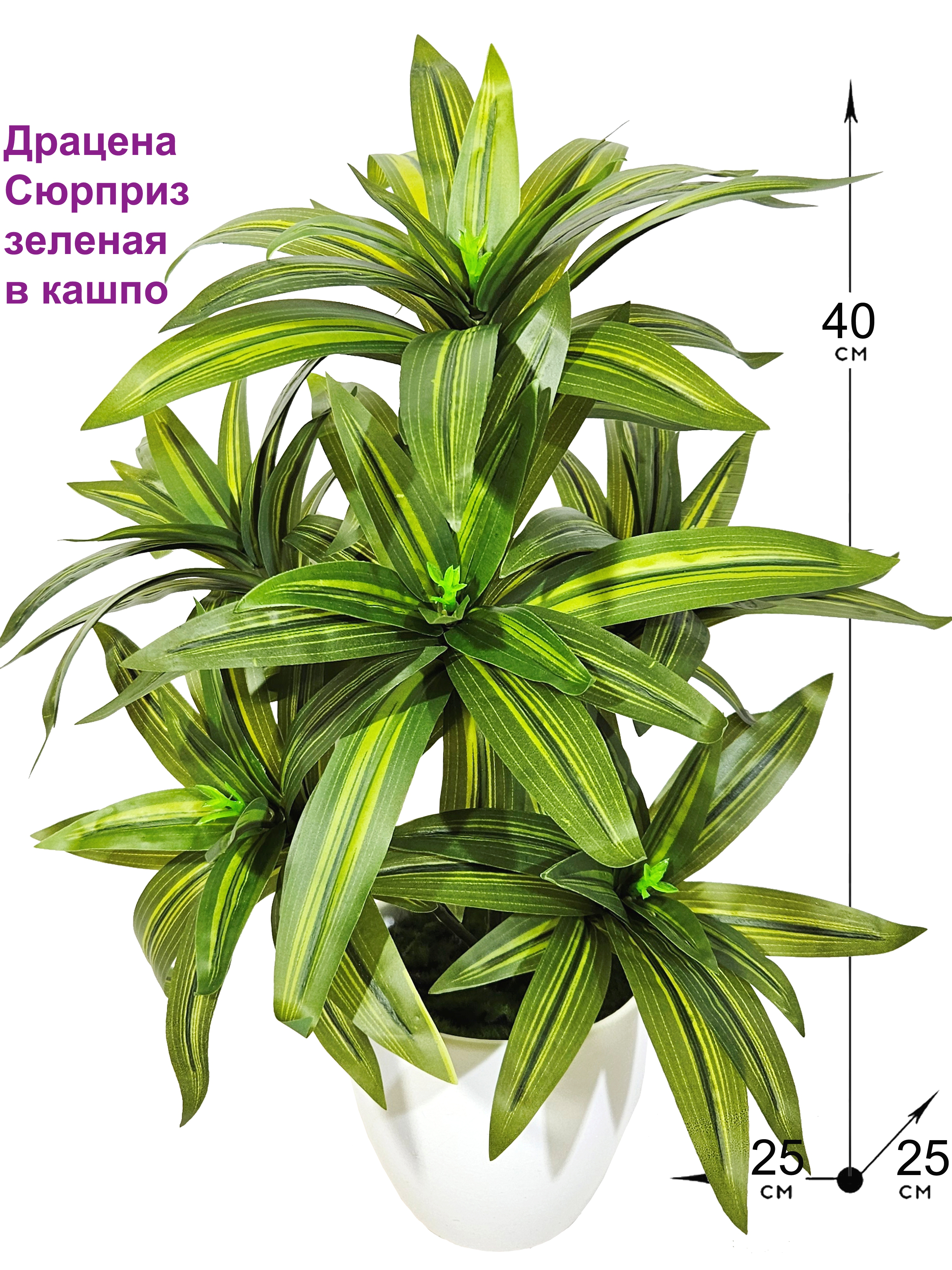 Очень реалистичное искусственное растение в кашпо - Драцена Сюрприз - станет украшением Вашего интерьера! Декоративное растение в кашпо не требует особого ухода, не боится влаги, можно ставить в ванную комнату, к бассейну и в сауну. Драцена декоративная в кашпо - это оригинальный элемент дизайна гостиной или рабочего кабинета, она украсит коридор или балкон, кухню или лоджию. Драцена сделает любую жилую комнату уютной, особенно если мало света и живые растения не растут.