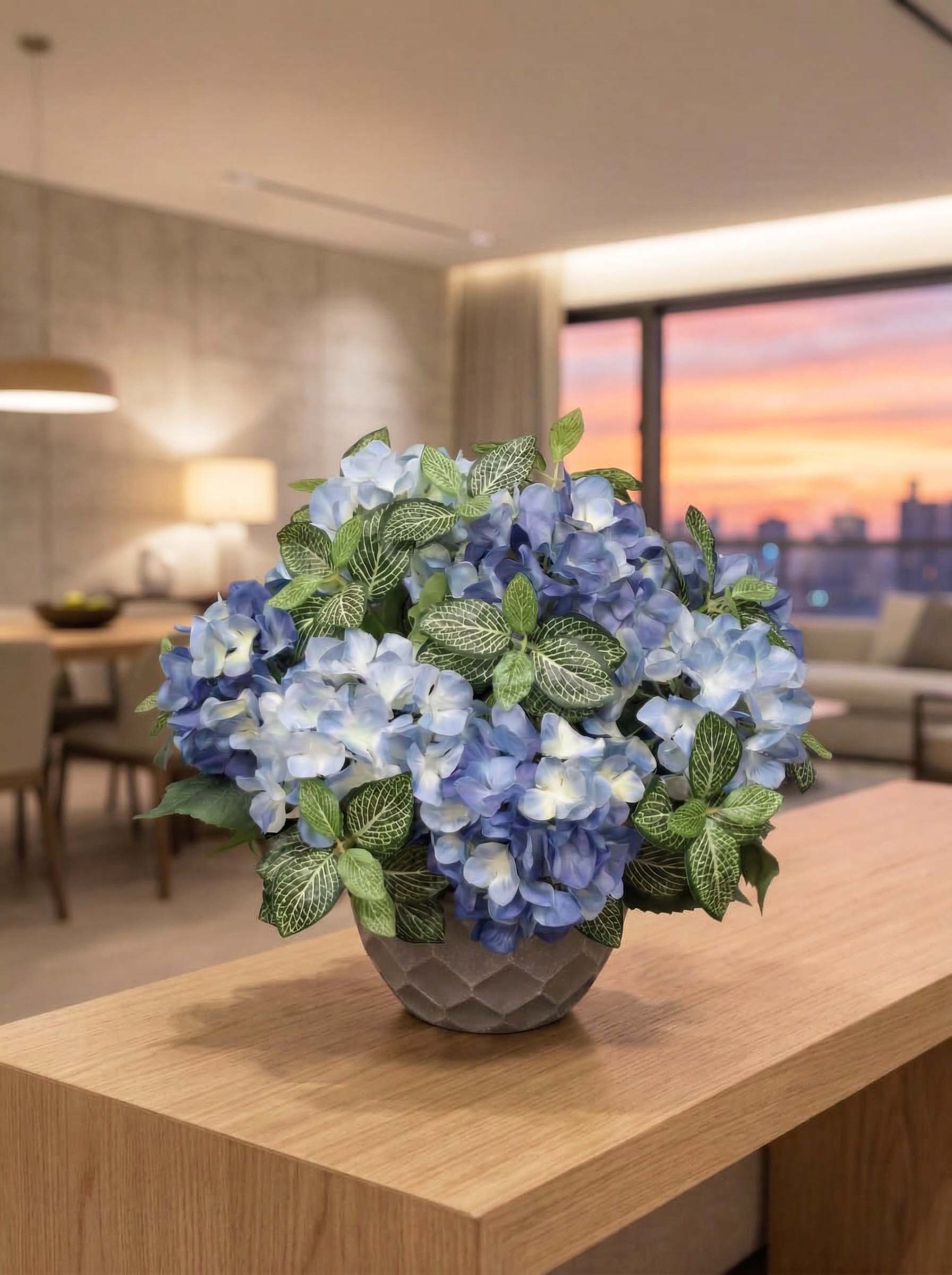 Погрузитесь в прохладу летних сумерек с нашей эффектной композицией из синих и голубых гортензий. Глубокие, насыщенные оттенки в сочетании с небесно-голубыми акцентами создают по-настоящему благородный и освежающий образ.