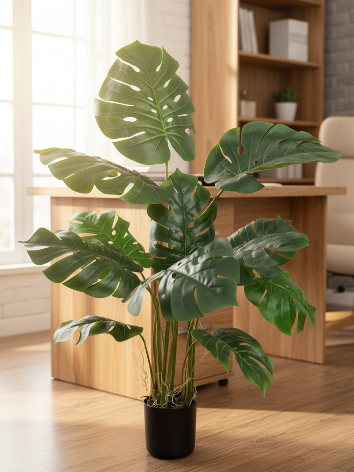 Искусственное растение монстера в горшке - это не просто декор, но и настоящее произведение искусства. У этого роскошного растения монстеры 12 листьев из плотного латекса, размеры маленького листа 24х18см, большого 42х35см. Оно создано из высококачественного материала, который имитирует внешний вид живого растения. Это значит, что вы можете наслаждаться красотой монстеры долгое время без забот, без необходимости ухода и полива.