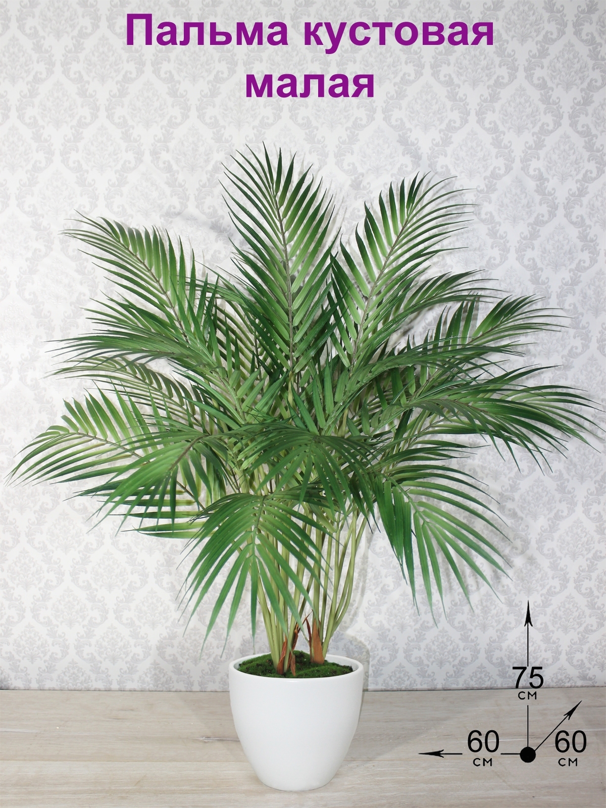 Искусственная Пальма кустовая малая 75см в кашпо от ФитоПарк - отличное решение для создания уютной атмосферы в интерьере. Это искусственное растение - прекрасный декор для интерьера офиса и дома, придаст помещению нотки природы и свежести. Пальма декоративная выполнена с высокой степенью реализма, ее ажурные листья имитируют живые, а прочный каркас обеспечивает устойчивость и долговечность. Кустовая форма пальмы придает ей особую изящность и элегантность, что делает ее идеальной для декорирования различных помещений, для декора кухни, гостиной или ванной комнаты, для террариума. Пальма искусственная закреплена в белом легком горшке, при желании ее можно поместить в свое высокое декоративное кашпо, как в напольное, так и в настольное. Этот декоративный цветок будет очаровательно смотреться в кашпо на ножках. Мы создали такую композицию, код товара 853518254. Размер растения легко регулируется, все листья пальмы на жесткой металлической основе и хорошо держат форму. Высота пальмы с кашпо составляет 75 см, что позволяет ей прекрасно смотреться как на полу, так и на столе или тумбе. Искусственные растения ФитоПарк созданы с любовью к природе и старательно повторяют все ее прекрасные детали.
