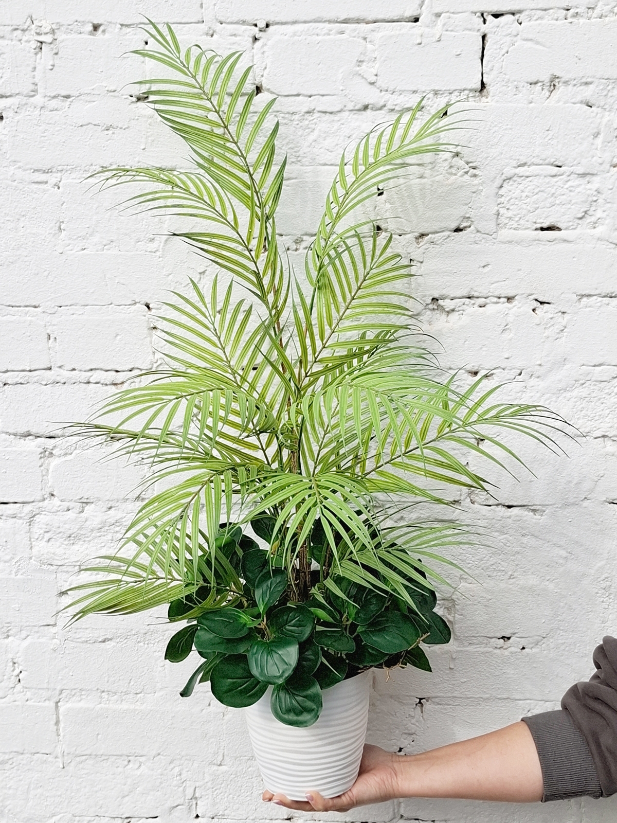 Искусственная пальма 70см с зеленью в кашпо - это почти живое комнатное растение! Красивые, изящные листья изготовлены из высококачественного латекса, ветки можно красиво изогнуть по вашему желанию. Пальма комнатная и пеперомия закреплены в белом кашпо из пластика диаметром 15см. Эти искусственные растения отличаются от живых только тем, что не требует полива и тщательного ухода. Достаточно лишь протереть листья влажной салфеткой или помыть. Декоративная пальма в горшке прекрасно дополнит любой интерьер, подойдет для дома, для офиса, для дачи или гостиницы, для магазина или салона. Эту композицию из искусственных растений можно использовать как украшение окна в офисе, как украшение кухни в доме, украшение для ванной комнаты или просто как декор гостиной или рабочего кабинета. Небольшой пальмой можно украсить бар, камин, окно, рабочий стол или остров на кухне.