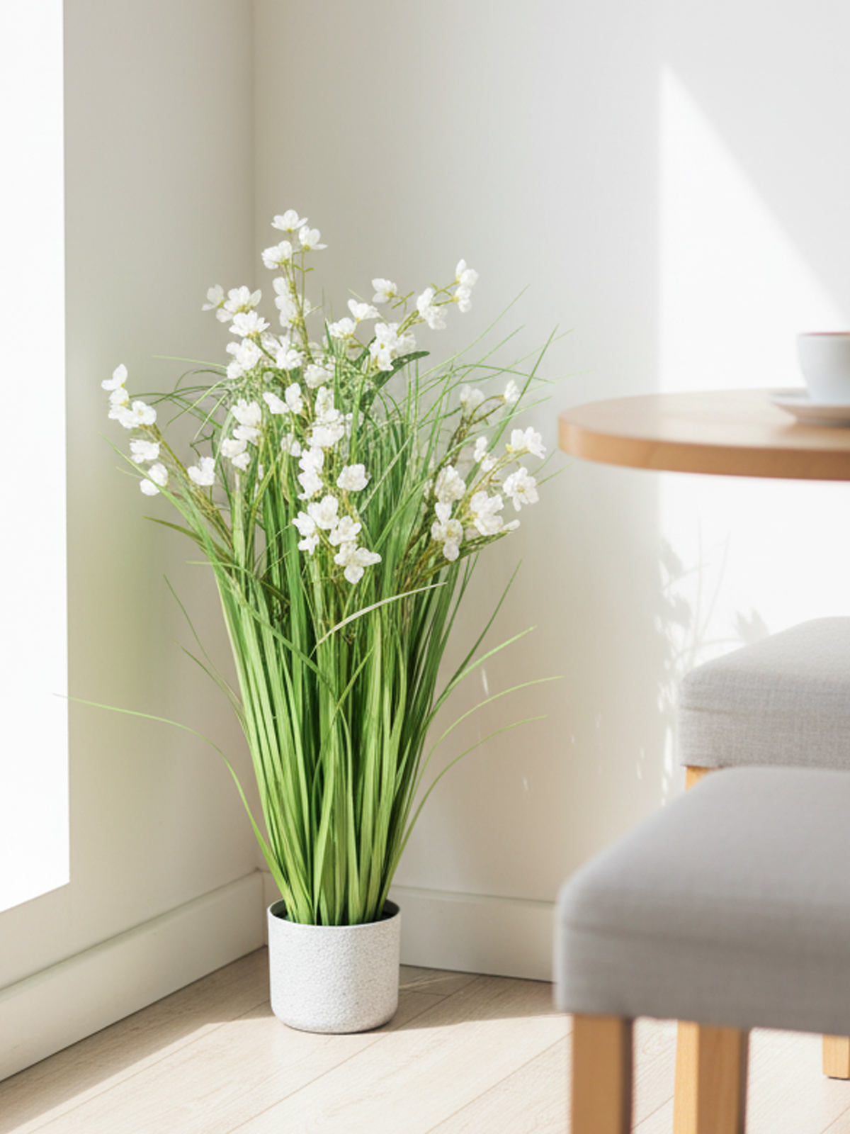 Ищете идеальное решение для оформления интерьера? Оцените нашу искусственную траву с белыми цветами высотой 90 см в кашпо. Созданная для тех, кто ценит красоту и практичность, она станет прекрасным дополнением вашего дома, офиса или сада.