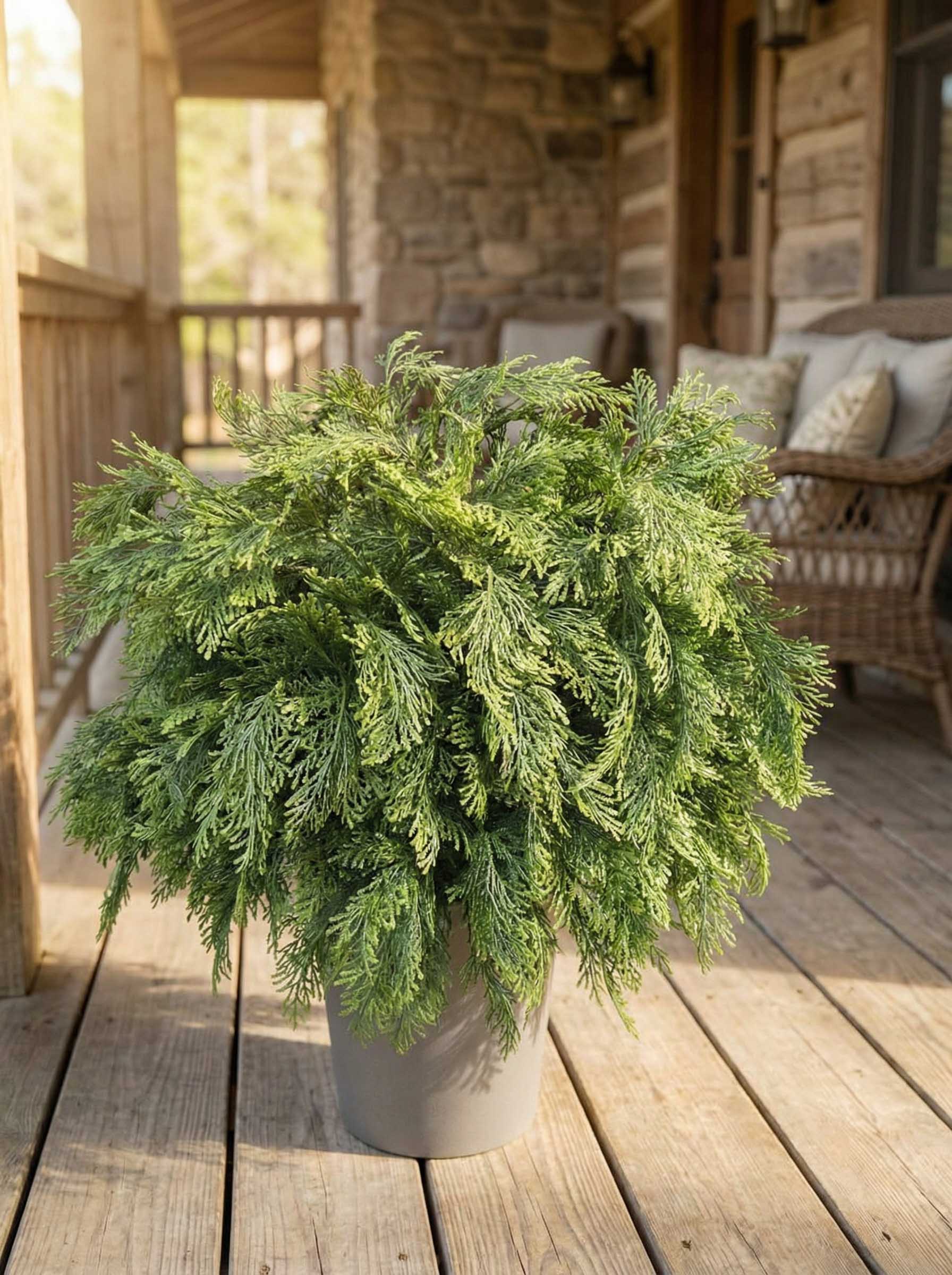 Хвоя выполнена в разных оттенках зелёного, а форма кроны далека от идеальной геометрии — как у настоящего растения. Благодаря этому туя смотрится выразительно и не выглядит «пластиковой».