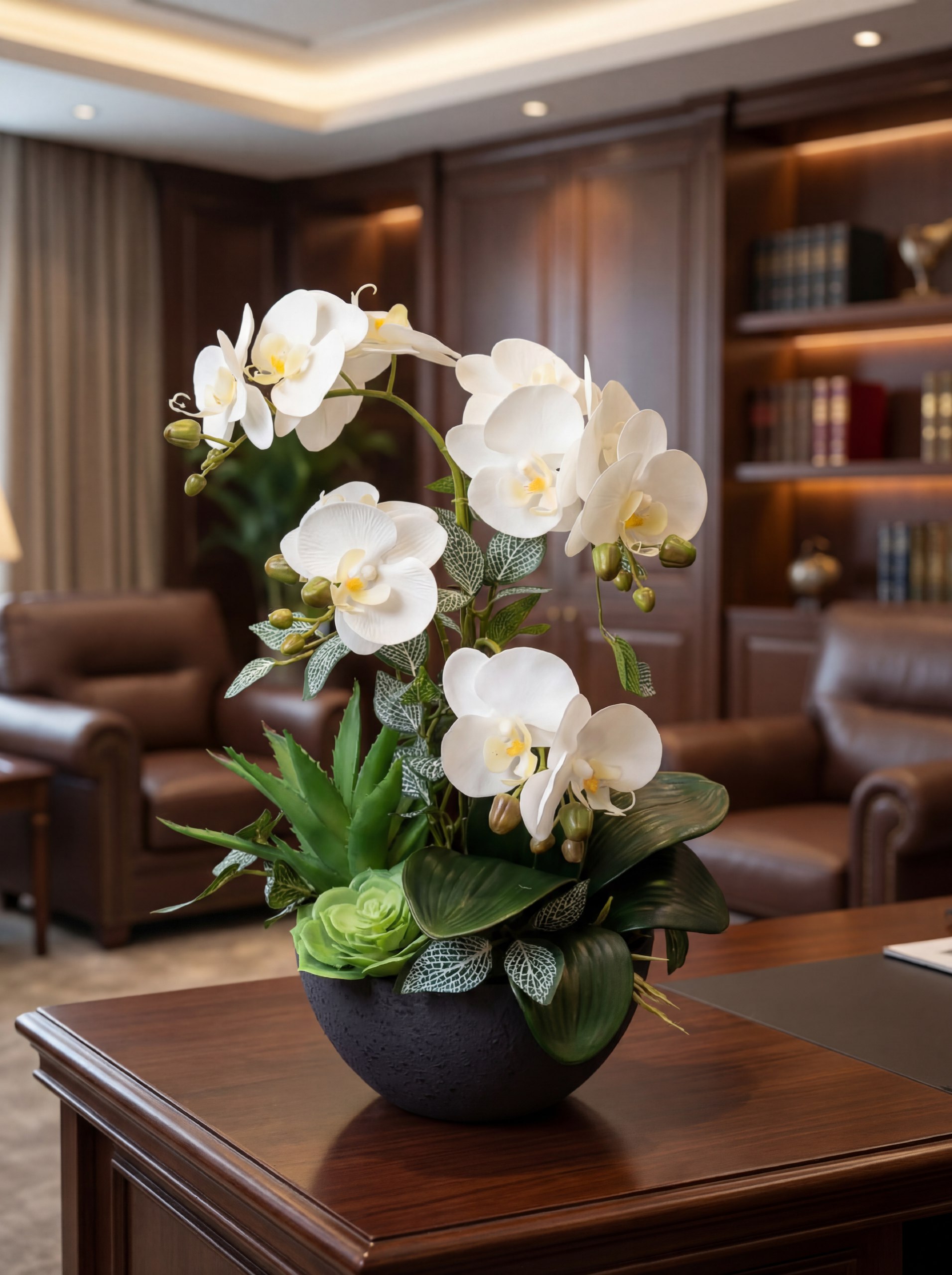 Каждое растение выполнено с вниманием к деталям, что делает их идеальными для создания уютного и современного интерьера. Вы можете легко разместить эту декоративную композицию на рабочем столе около компьютера, на журнальном столике, на ресепшн, на полочке, придавая пространству завершенность и гармонию.