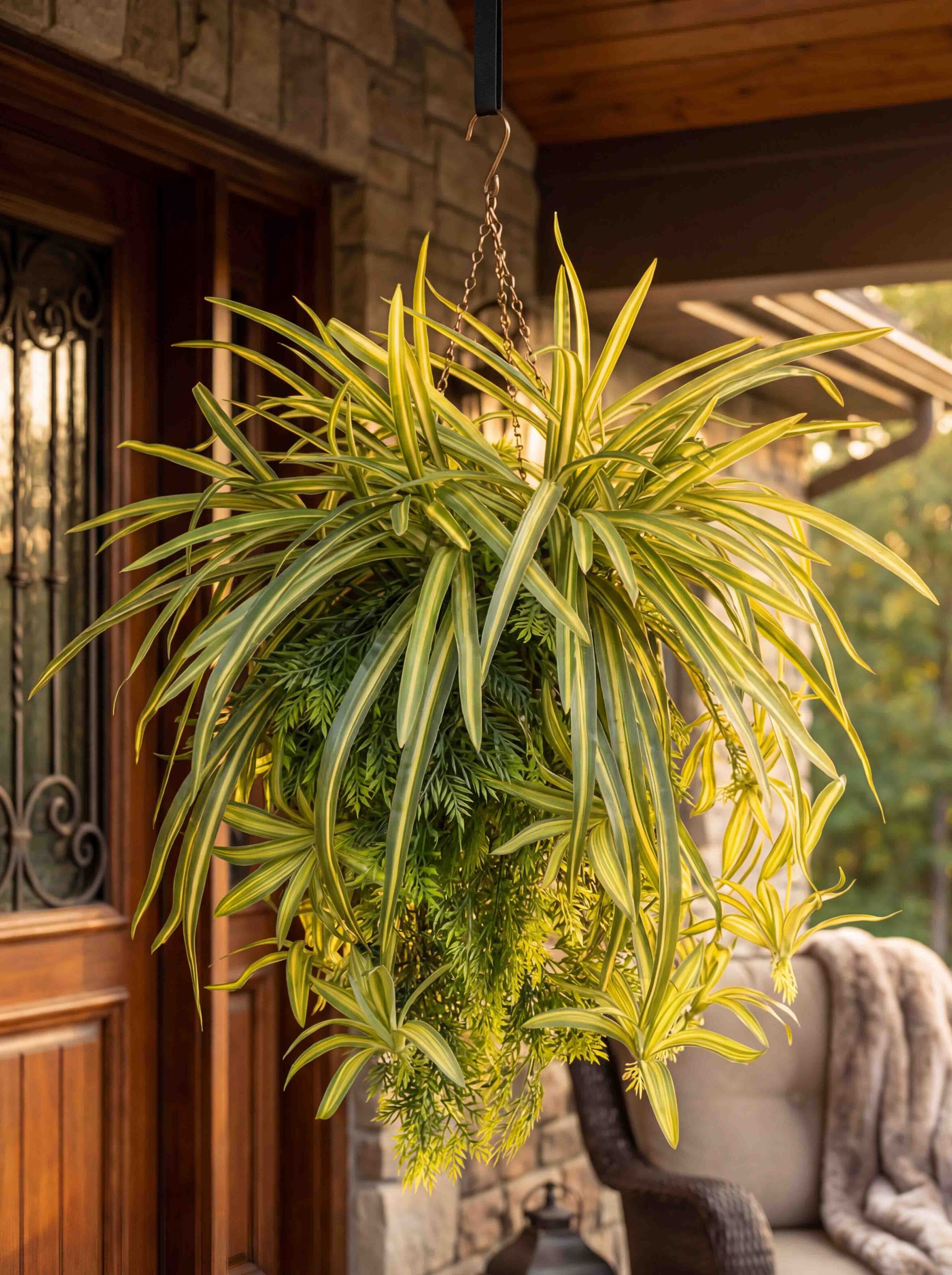 Искусственное растение Хлорофитум с зеленью в подвесном черном кашпо