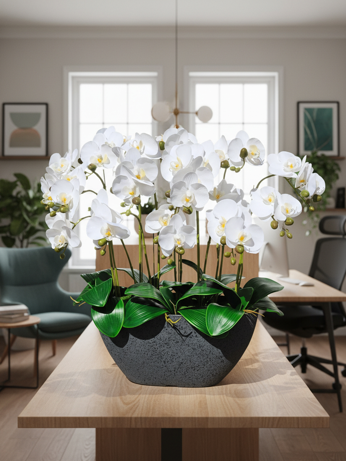 Кашпо овальной формы серо-черного цвета отлично подчеркивает элегантность белых орхидей, создавая гармоничный контраст. Такой декор идеально подойдет для стильной гостиной, для ванной комнаты или коридора. Орхидеи искусственные в стильном кашпо украсят ресепшн, стол переговоров, большой рабочий стол или комнату отдыха.