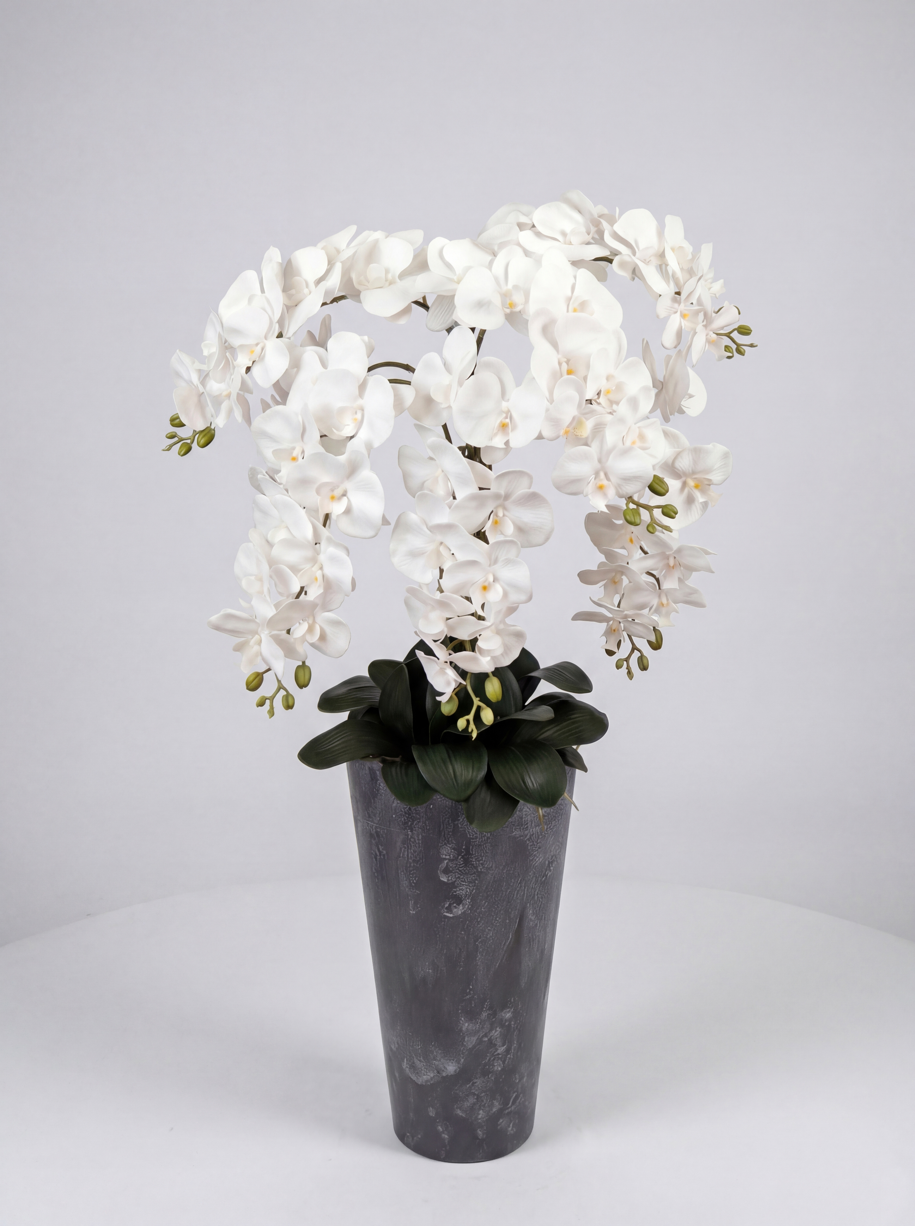 Приобретая напольные искусственные цветы орхидеи, вы можете быть уверены, что они будут радовать вас долгие годы. Не требующие особого ухода, искусственные цветы орхидеи идеально вписываются в повседневную жизнь, а игра белого и черного вносит оригинальный штрих в ваш интерьер! Орхидея декоративная - это отличный выбор для тех, кто хочет создать атмосферу домашнего уюта или оформить квартиру белыми цветами, но не имеет времени на регулярный полив и уход за живыми растениями.