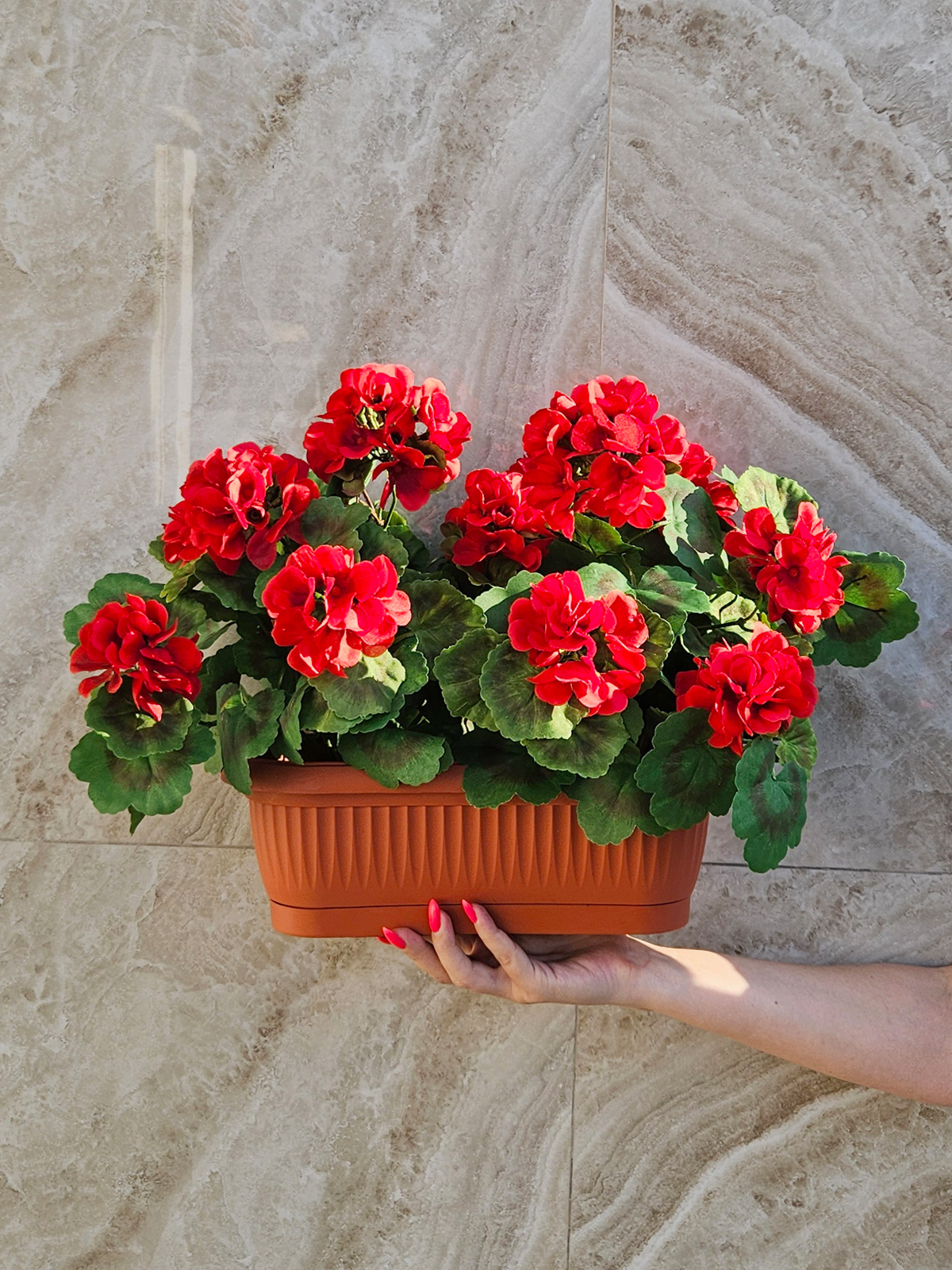 Кашпо для герани из пластика, в нем закреплены два куста герани. Вы сможете легко разместить его на вашем балконе или окне, при необходимости поместить в свое декоративное кашпо.