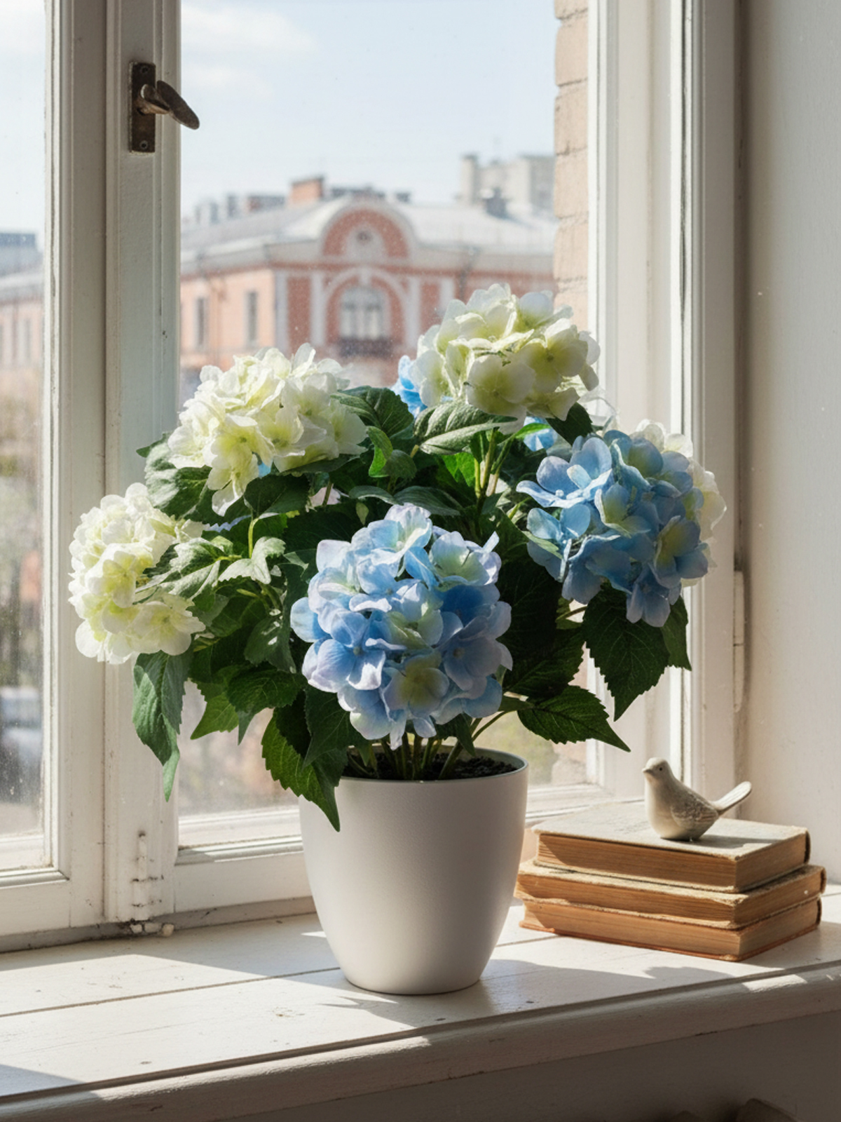 Цветы гортензии в белом кашпо станут отличным акцентом в вашем интерьере, подчеркнув индивидуальность вашего стиля. Они идеально вписываются в любой дизайн – от классического до современного. Белое кашпо гармонично сочетается с любыми цветами, создавая элегантный и утончённый вид.