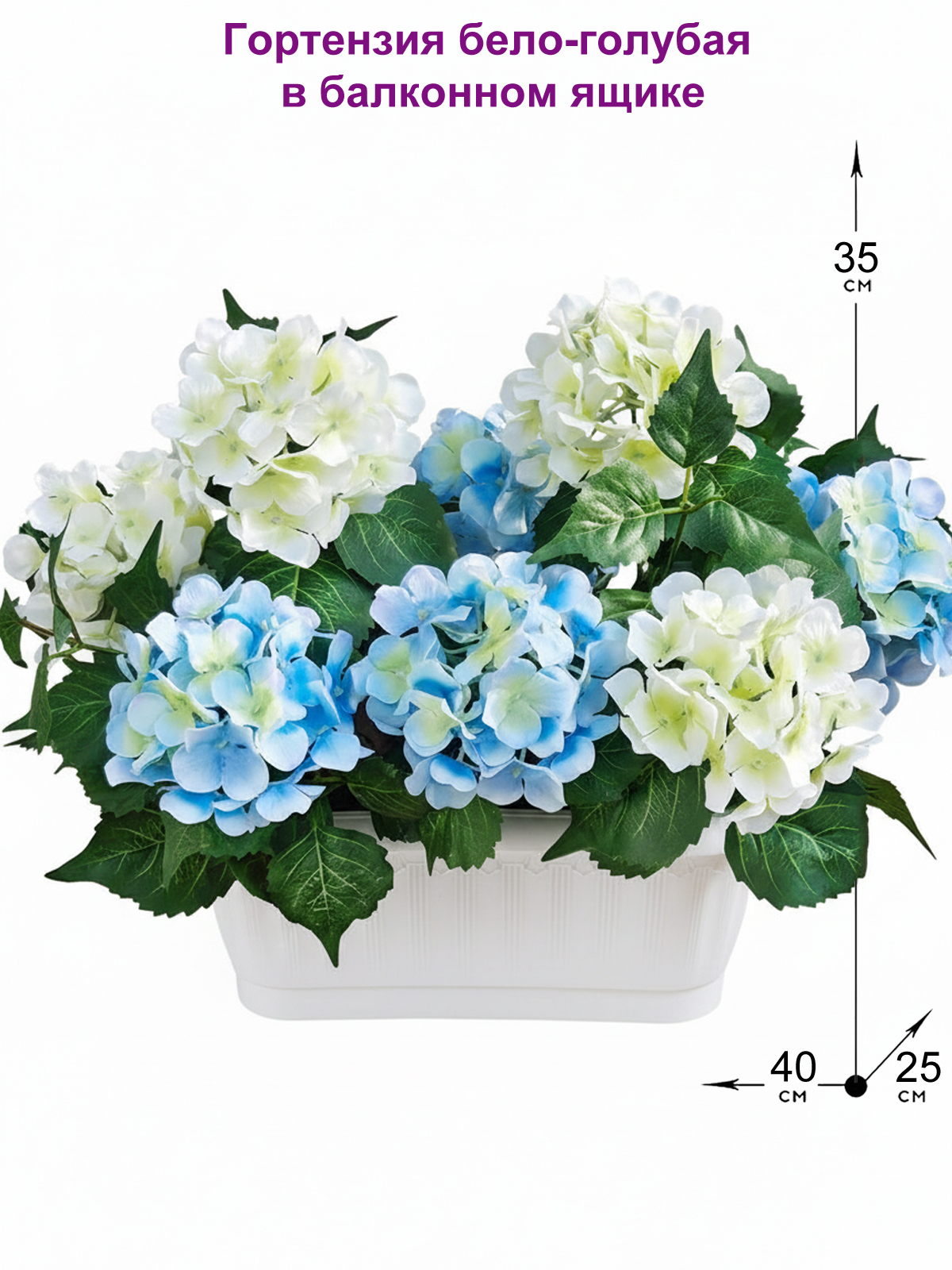 Размеры гортензии в балконном ящике ВхШхГ: 35х40х25 см.