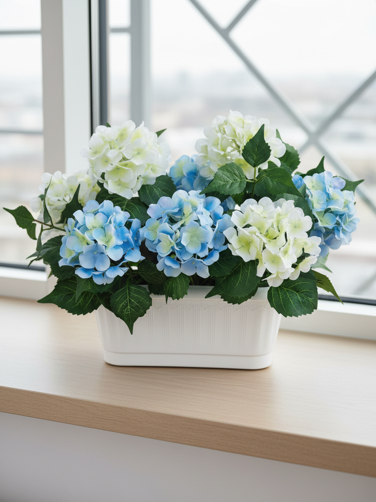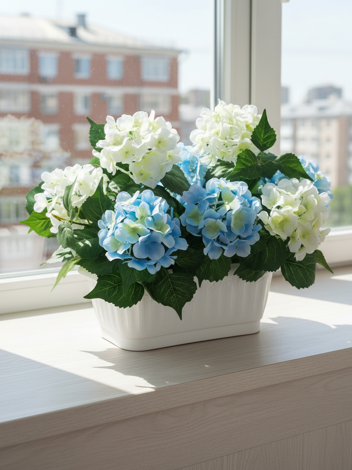 Если вы ищете красивую и практичную декоративную деталь, гортензия цветная в горшке станет отличным решением. Гидрангея голубая в балконном ящике идеально впишется в любой интерьер. Она выглядит настолько натурально, что ваши гости и не догадаются, что это искусственный цветок.