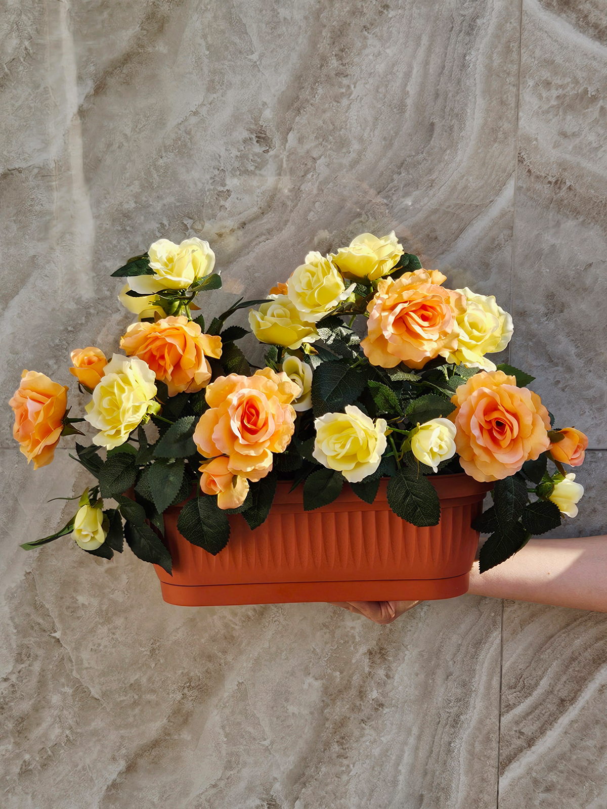 Искусственные цветы Розы желто-оранжевые в балконном ящике от бренда ФитоПарк – это идеальный декор для дома, дачи, школы или магазина! Эти декоративные розы придадут вашему интерьеру уют и элегантность, будь то ваш балкон, подоконник или садовая зона.