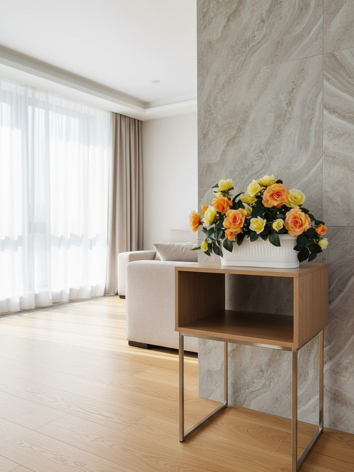 Размещенные в стильном белом кашпо, эти искусственные розы выглядят максимально натурально, что позволяет использовать их в самых различных местах: оформление подоконника на кухне или в гостиной, для украшения детской комнаты или веранды. Благодаря насыщенному желто-оранжевому оттенку, композиции из кустов роз оживят любое пространство и создадут атмосферу уюта и комфорта.