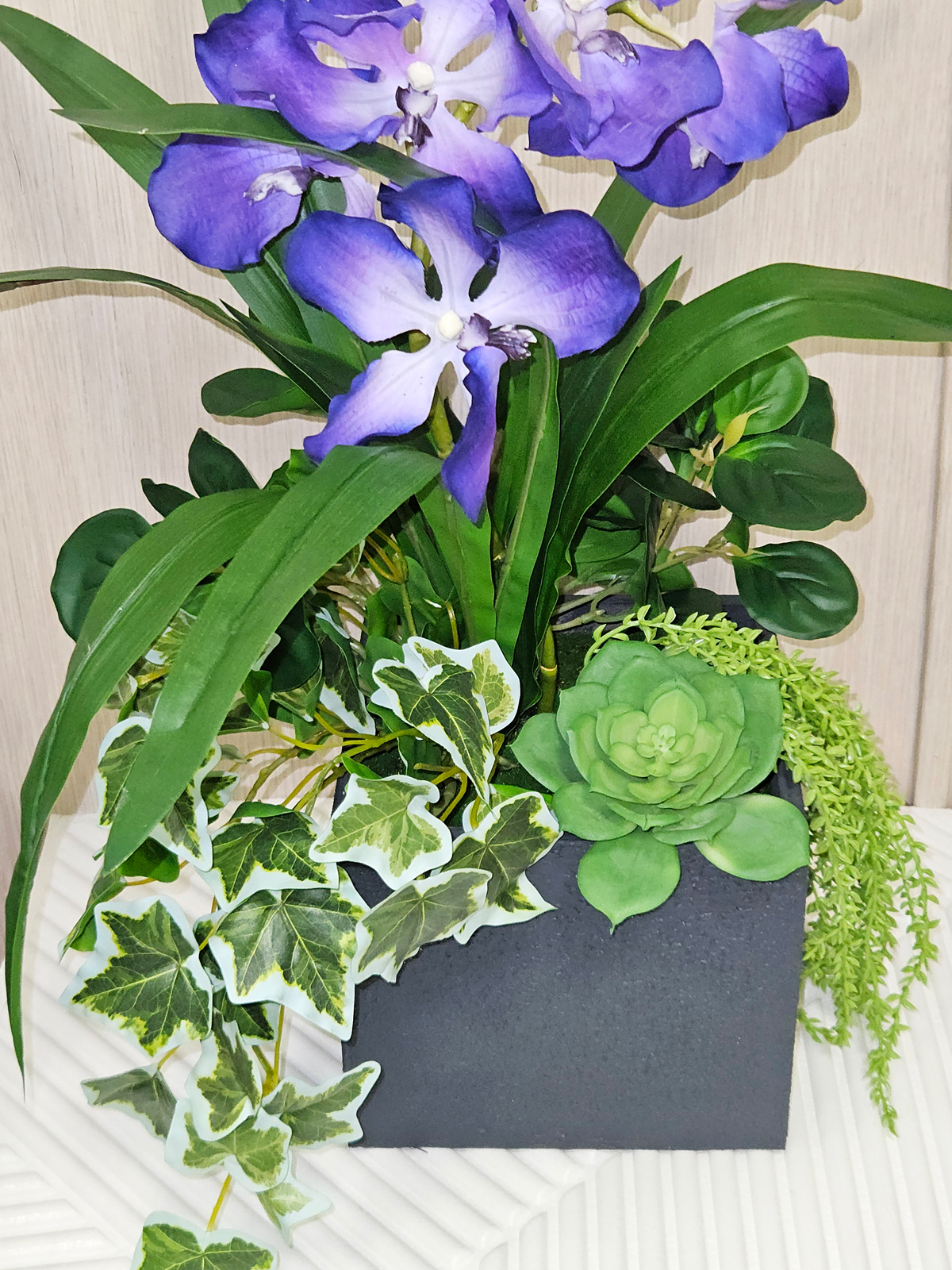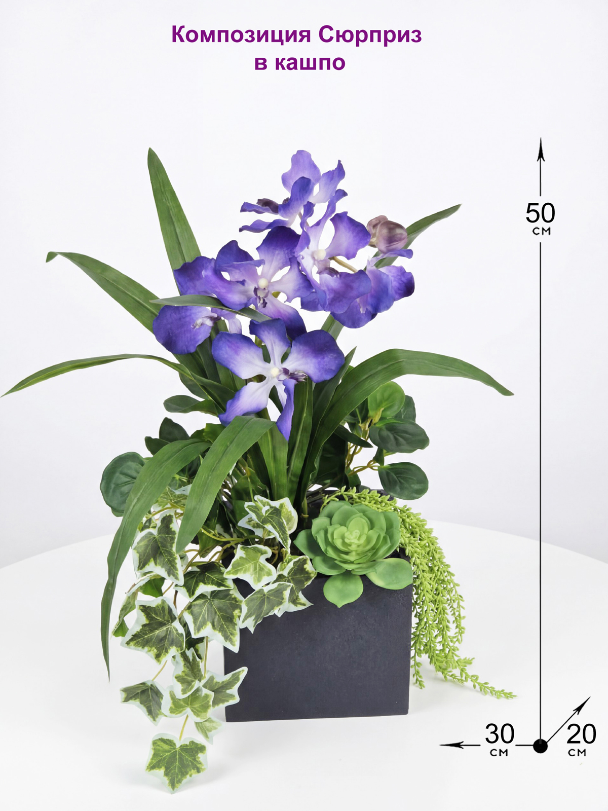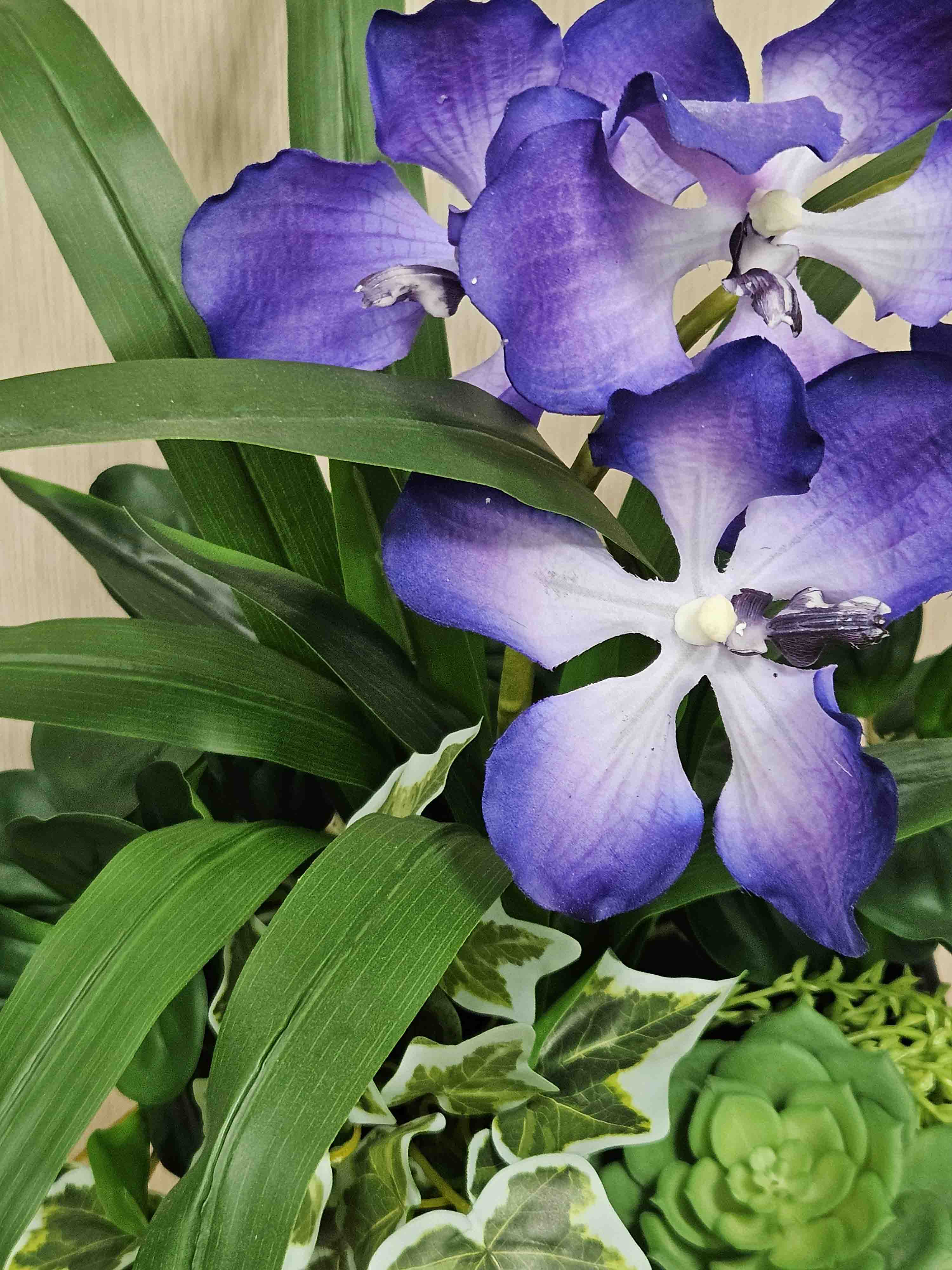 Добавьте в свой дом или офис природную гармонию с помощью этой очаровательной композиции из искусственных растений от Фитопарк. Эта авторская композиция, включающая в себя редкие орхидеи Ванда и изящный английский плющ, станет настоящим украшением любого интерьера. Нежные фиолетовые орхидеи, реалистично выполненные из латекса, гармонично сочетаются с сочной зеленью, создавая ощущение свежести и уюта. Искусственные растения в кашпо выглядят очень естественно, вы сможете наслаждаться их красотой, а главное - без необходимости в уходе.