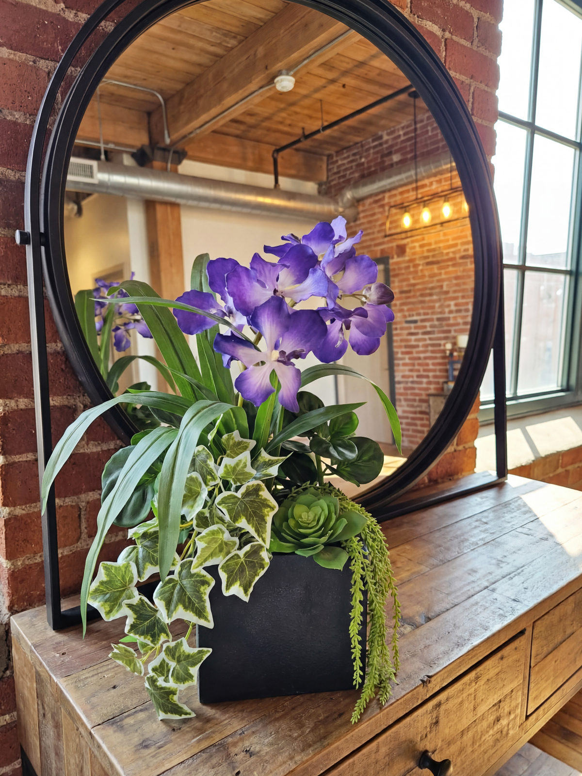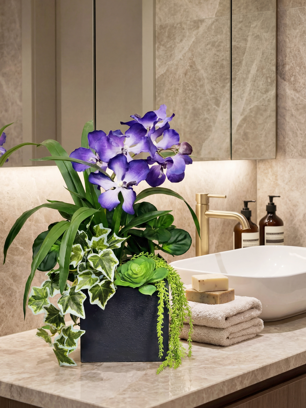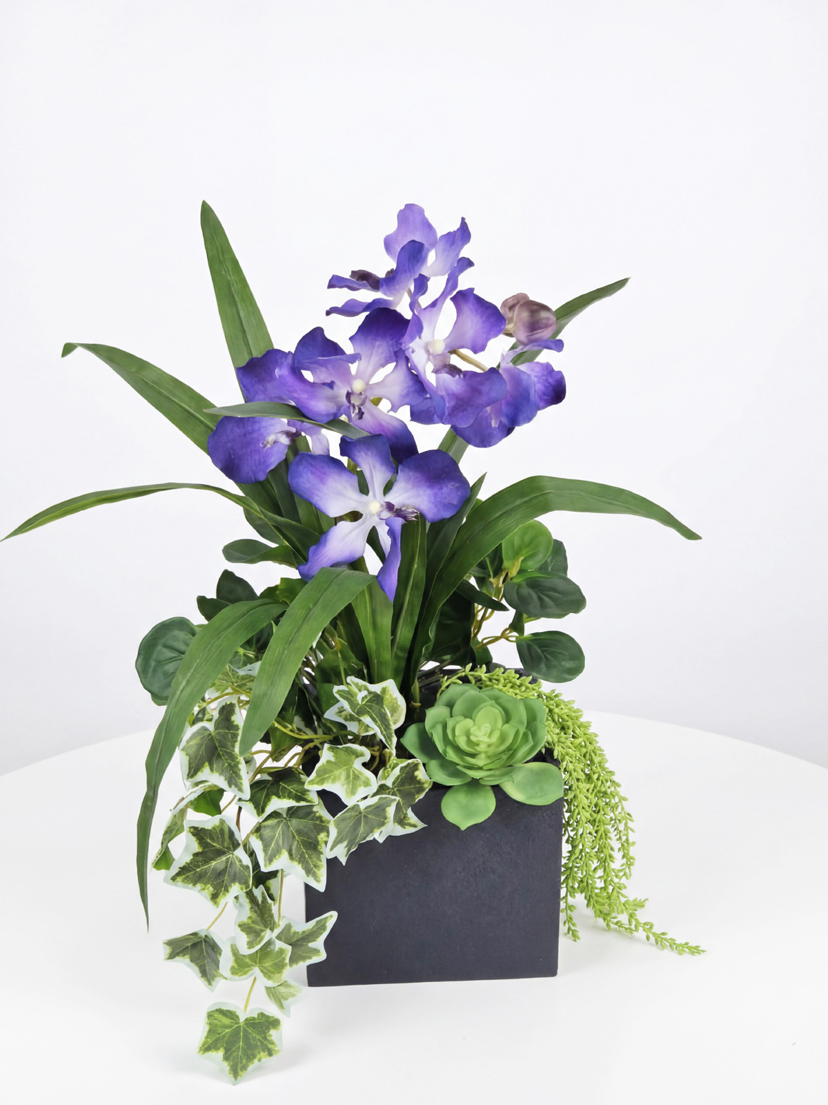 Добавьте в свой дом или офис природную гармонию с помощью этой очаровательной композиции из искусственных растений от Фитопарк. Эта авторская композиция, включающая в себя редкие орхидеи Ванда и изящный английский плющ, станет настоящим украшением любого интерьера. Нежные фиолетовые орхидеи, реалистично выполненные из латекса, гармонично сочетаются с сочной зеленью, создавая ощущение свежести и уюта. Искусственные растения в кашпо выглядят очень естественно, вы сможете наслаждаться их красотой, а главное - без необходимости в уходе.