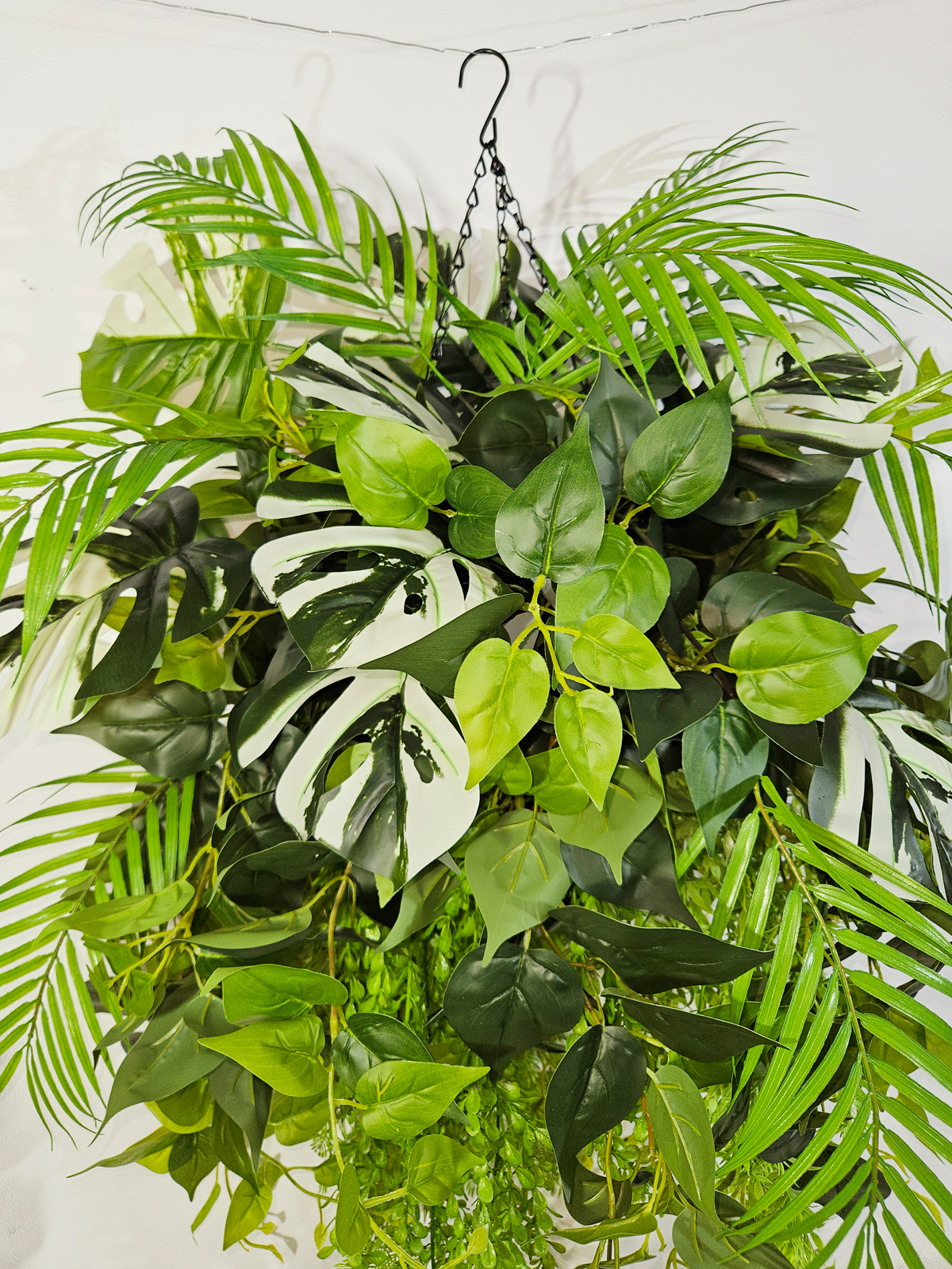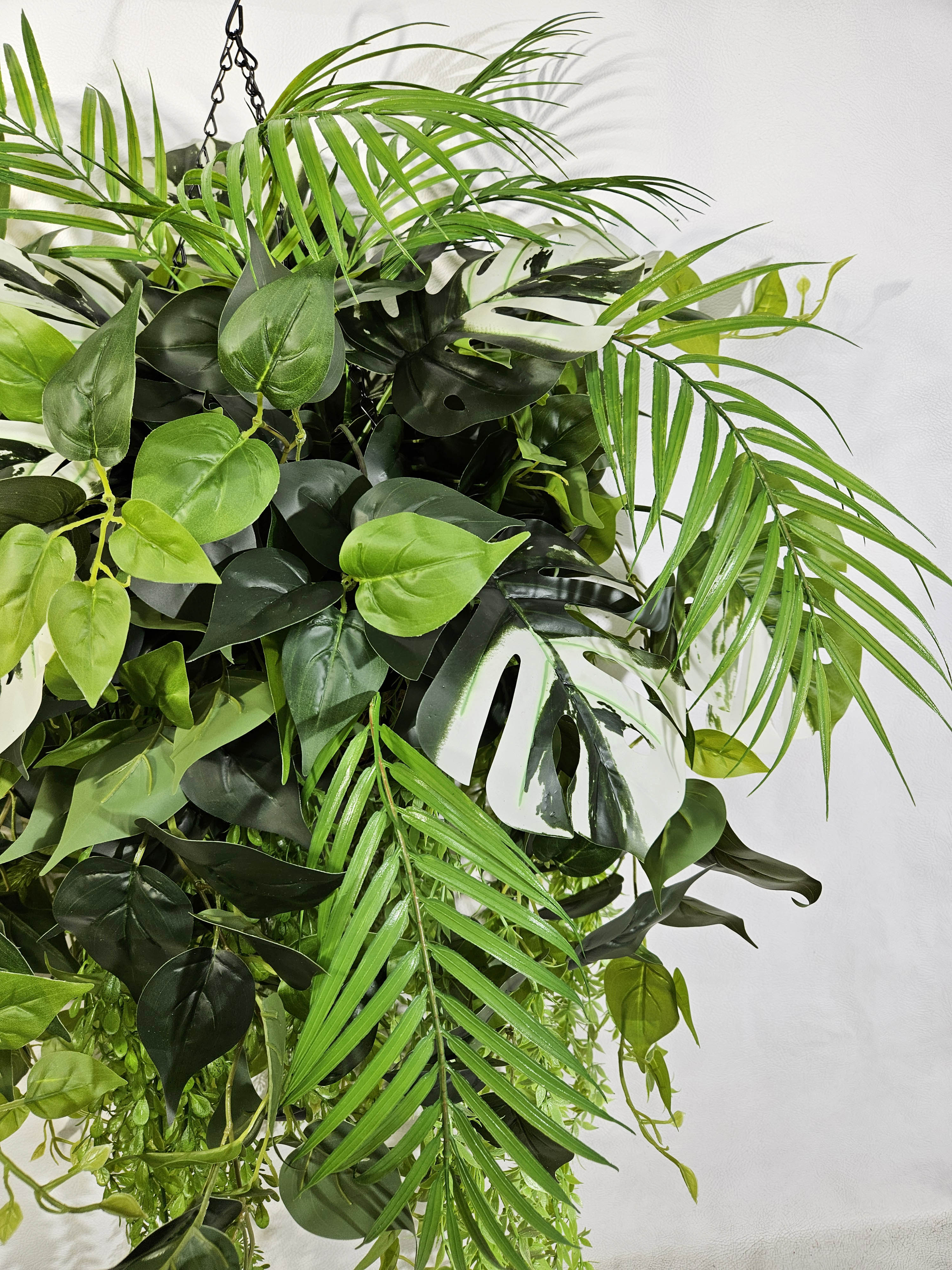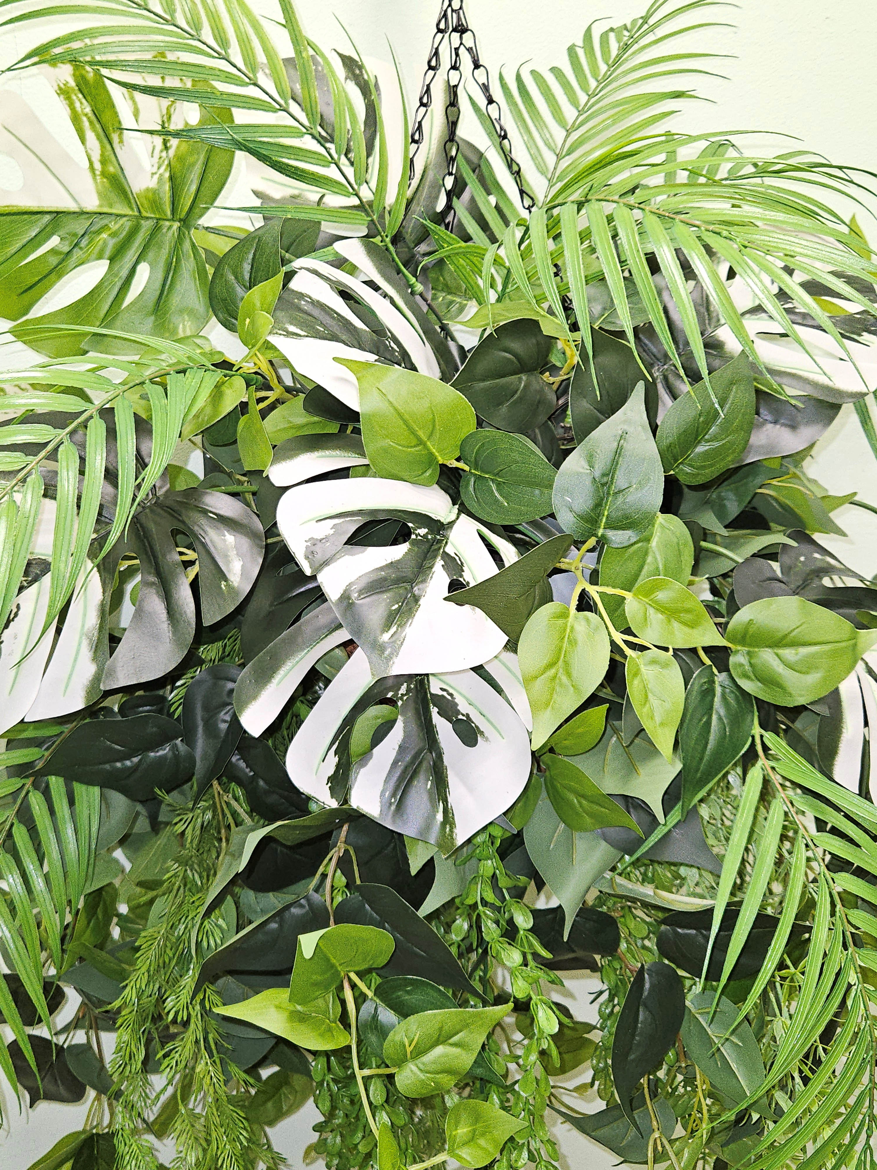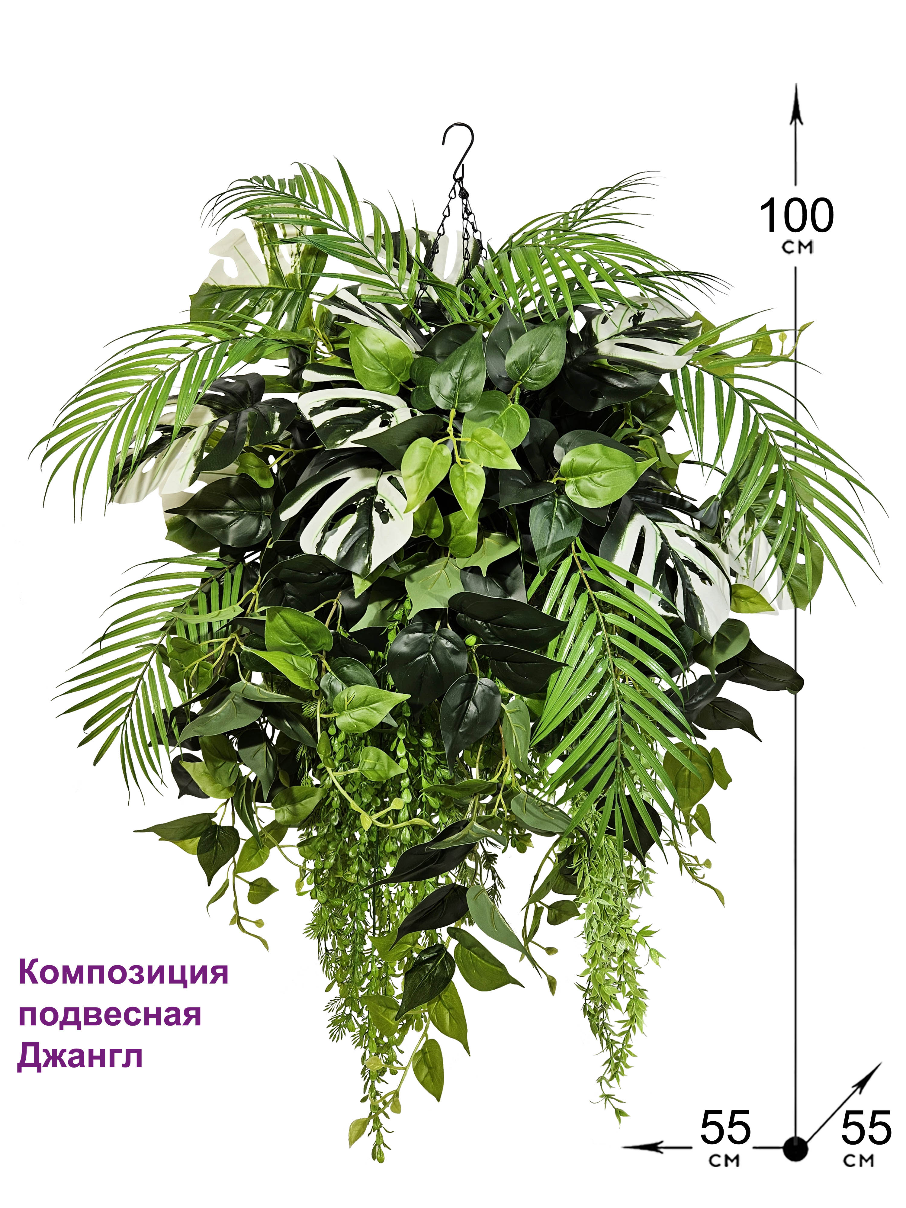 Создайте весеннее настроение в своем доме с помощью этой очаровательной искусственной зелени в подвесном горшке! Декоративная композиция из реалистичных пальм, филодендронов и монстеры в сочетании с искусственными лианами и натуральной ампельной зеленью создаст уютную атмосферу в любом помещении. Искусственные цветы в подвесном кашпо большие выглядят так же свежо и красиво, как живые цветы, но при этом не требуют ухода и полива. Кашпо на цепочке подвесное с большой зеленой композицией станет прекрасным дополнением к фитодизайну вашей квартиры, дачи или офиса, а также оригинальным подарком для любимой, мамы или коллеги на 8 марта или день Святого Валентина!