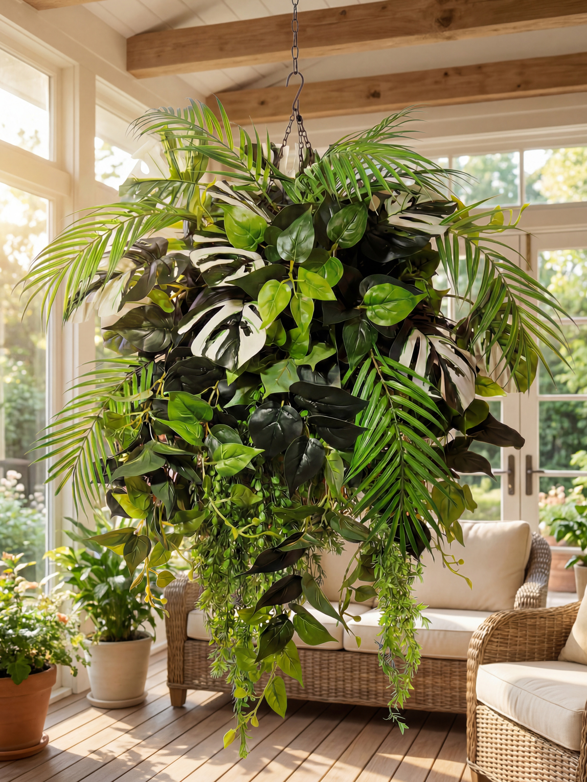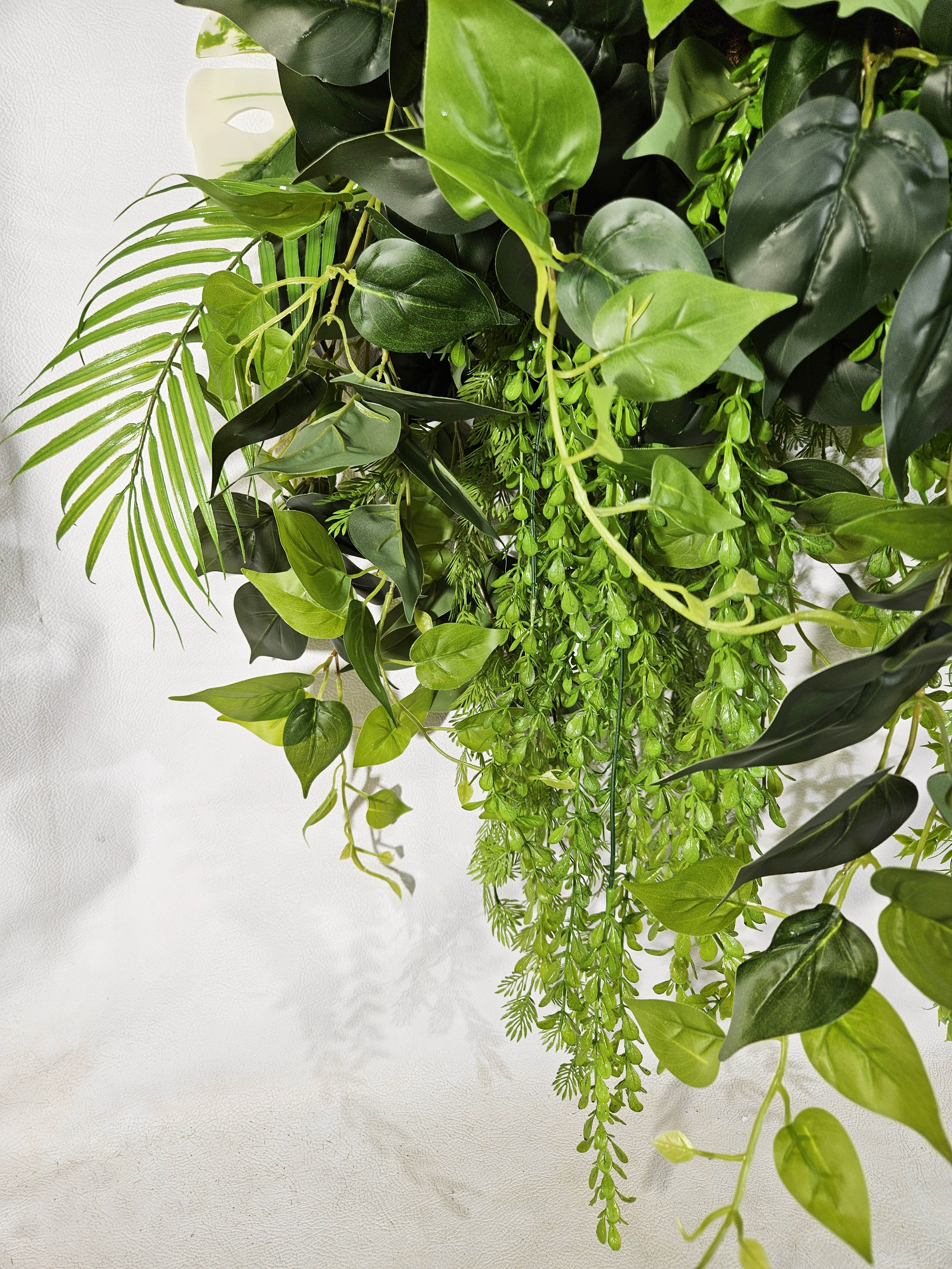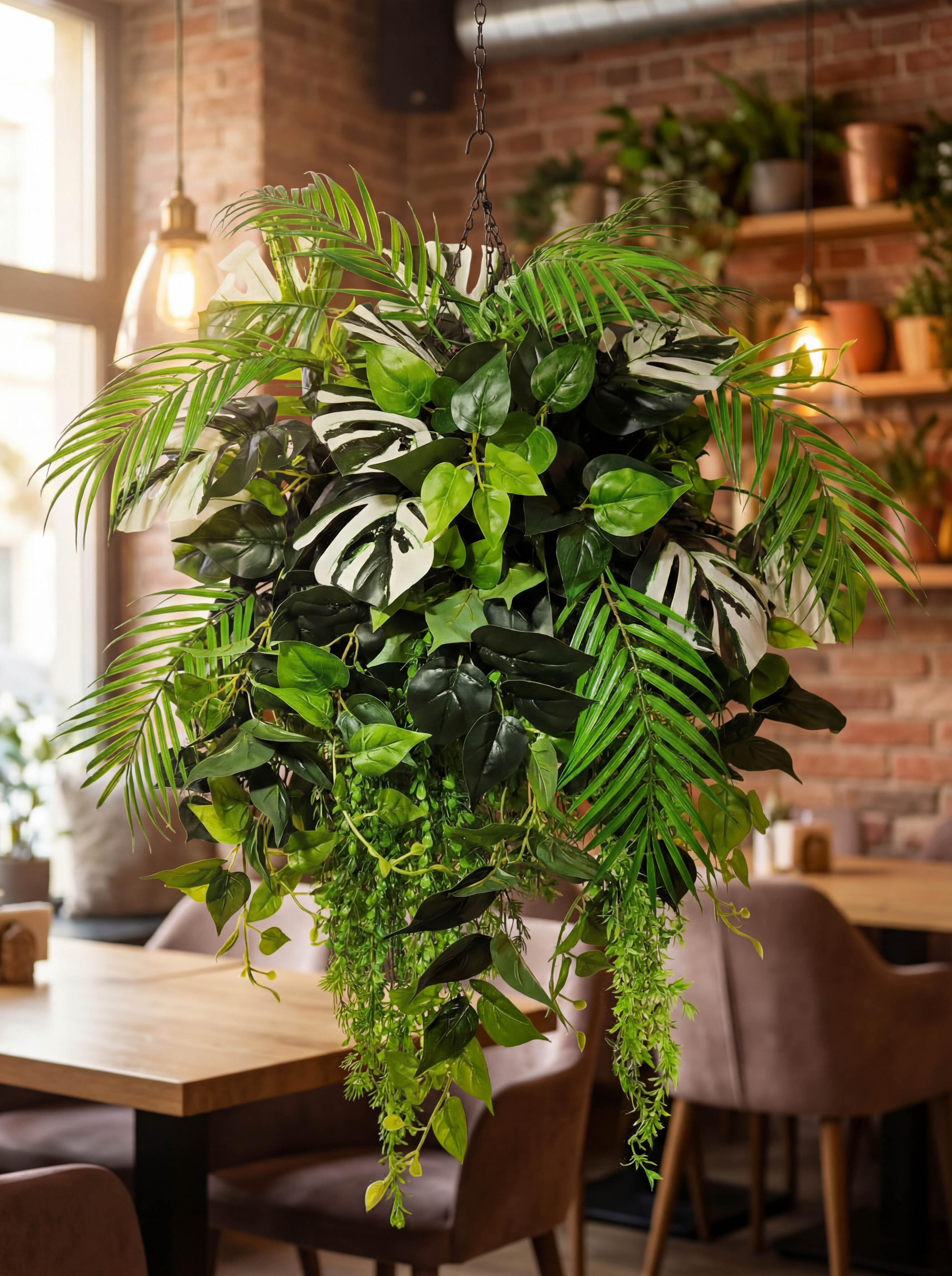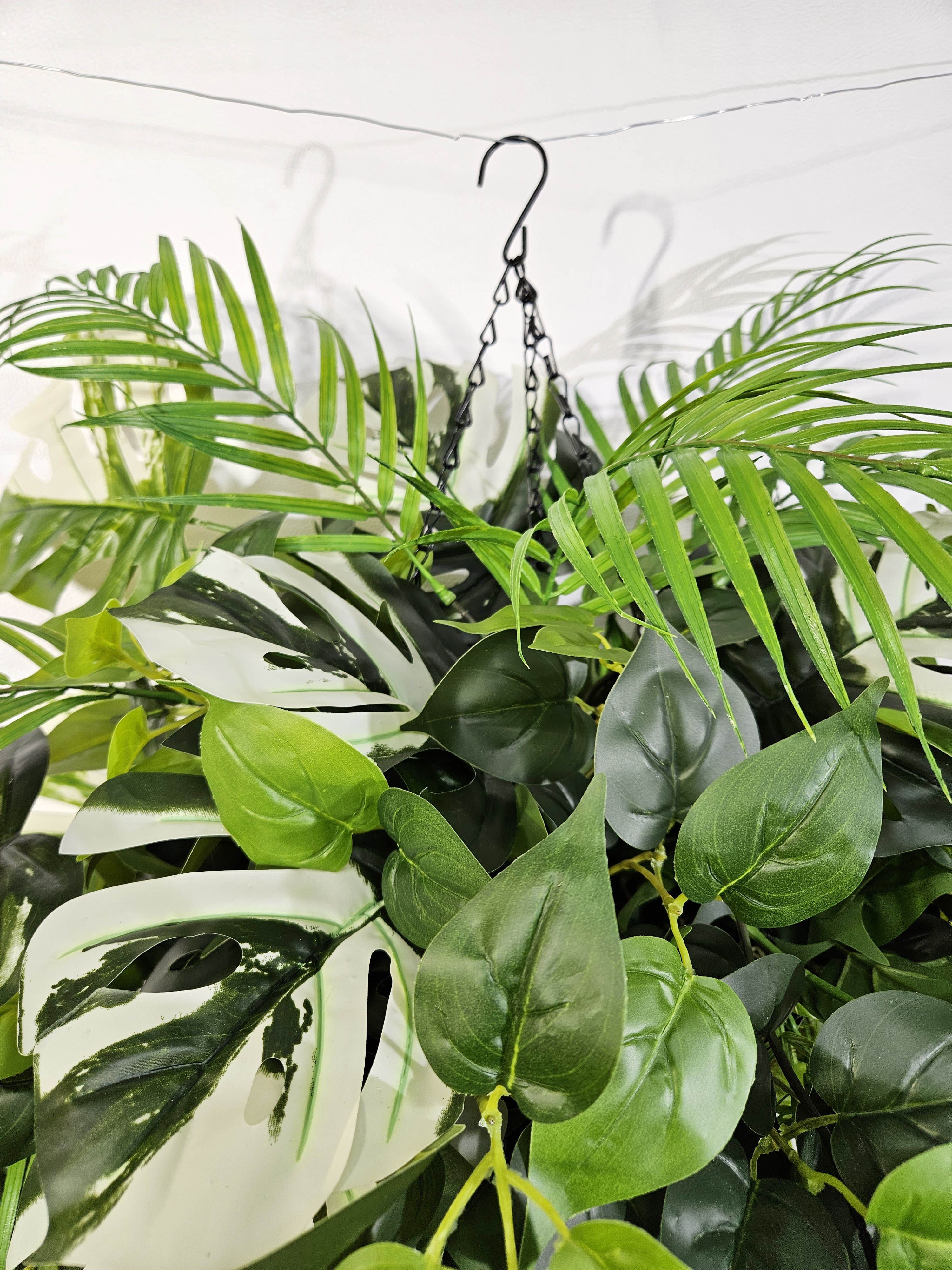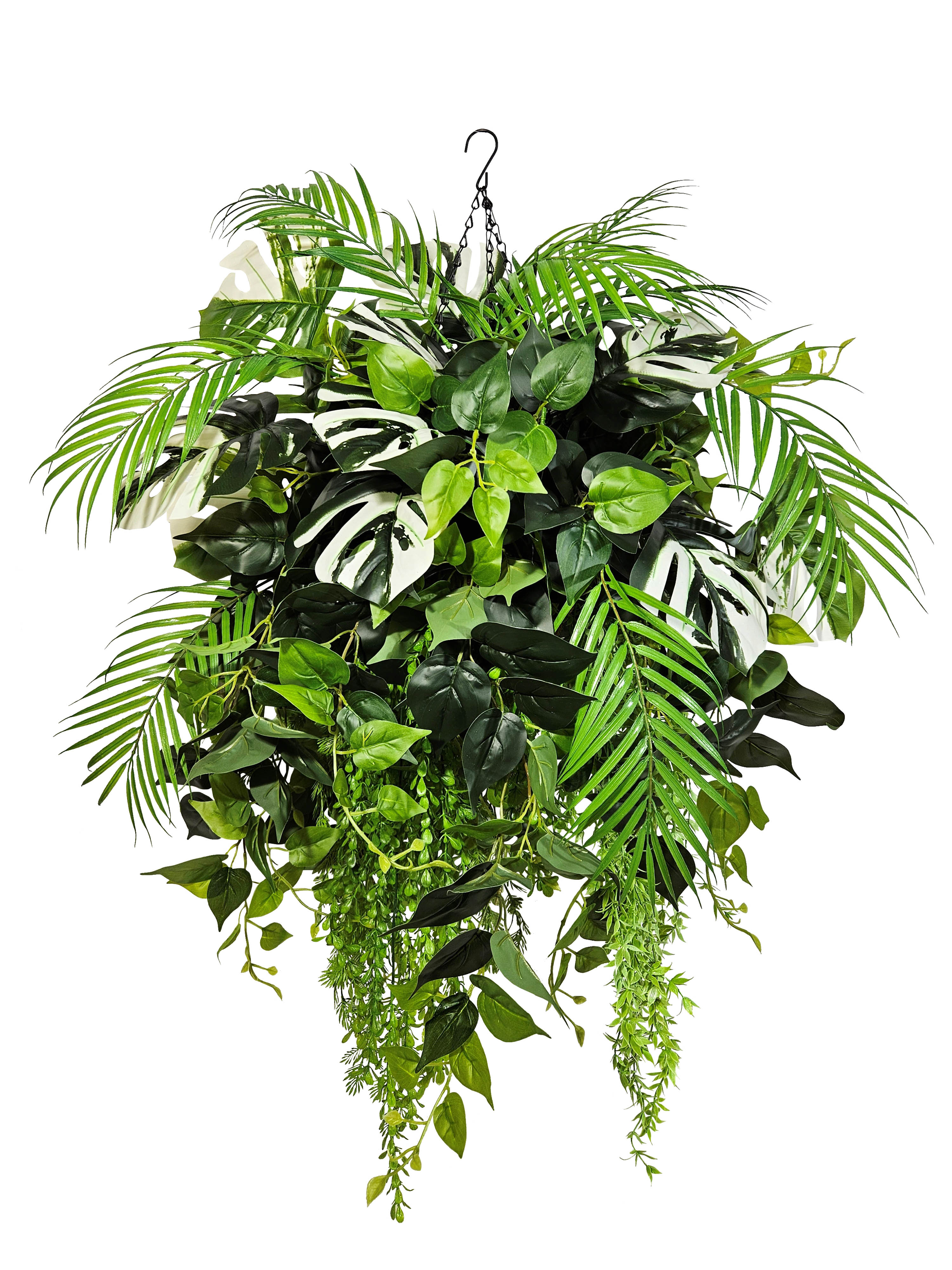 Создайте весеннее настроение в своем доме с помощью этой очаровательной искусственной зелени в подвесном горшке! Декоративная композиция из реалистичных пальм, филодендронов и монстеры в сочетании с искусственными лианами и натуральной ампельной зеленью создаст уютную атмосферу в любом помещении. Искусственные цветы в подвесном кашпо большие выглядят так же свежо и красиво, как живые цветы, но при этом не требуют ухода и полива. Кашпо на цепочке подвесное с большой зеленой композицией станет прекрасным дополнением к фитодизайну вашей квартиры, дачи или офиса, а также оригинальным подарком для любимой, мамы или коллеги на 8 марта или день Святого Валентина!