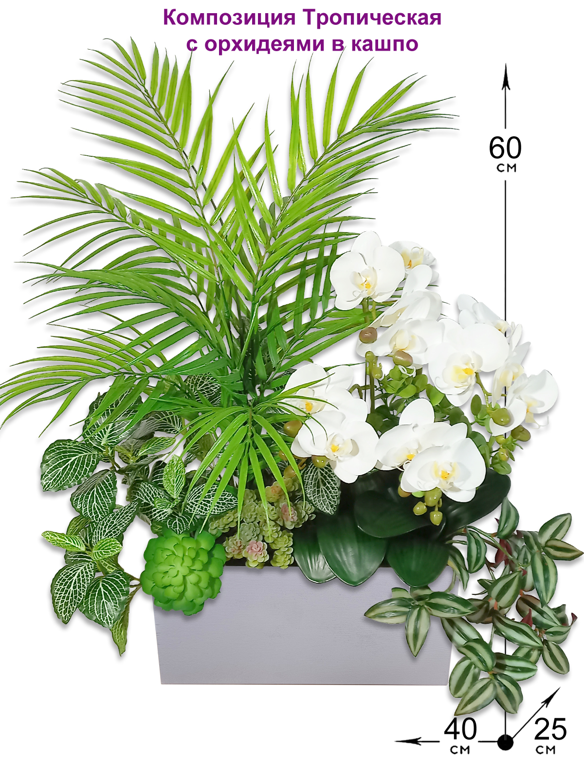 Композиция из искусственных растений - Тропическая с белыми орхидеями и папоротником в длинном сером кашпо от ФитоПарк - это идеальное решение для создания уютной атмосферы в вашем доме или офисе. Эти декоративные цветы и растения - пальма Хамедорея и белые орхидеи фаленопсис - не только прекрасно смотрятся, но и не требуют особого ухода, что делает их идеальными для занятых людей или тех, кто не имеет опыта в садоводстве.