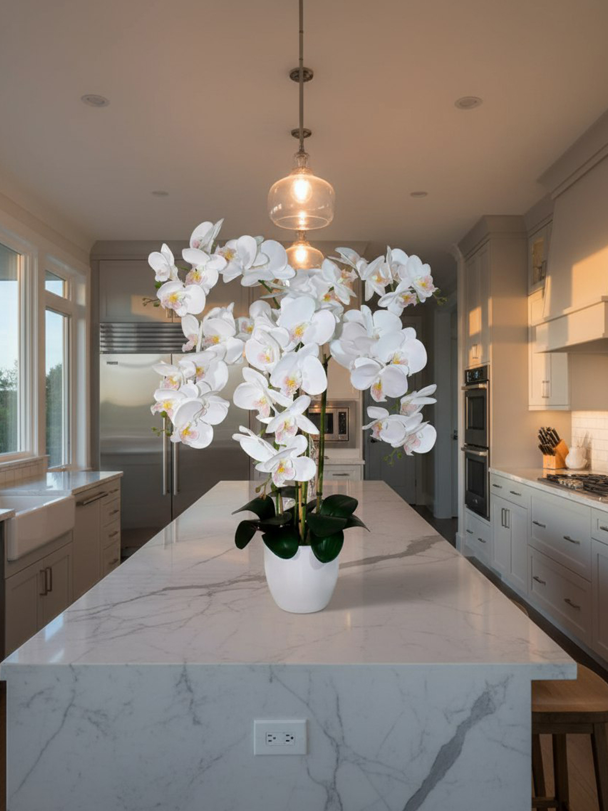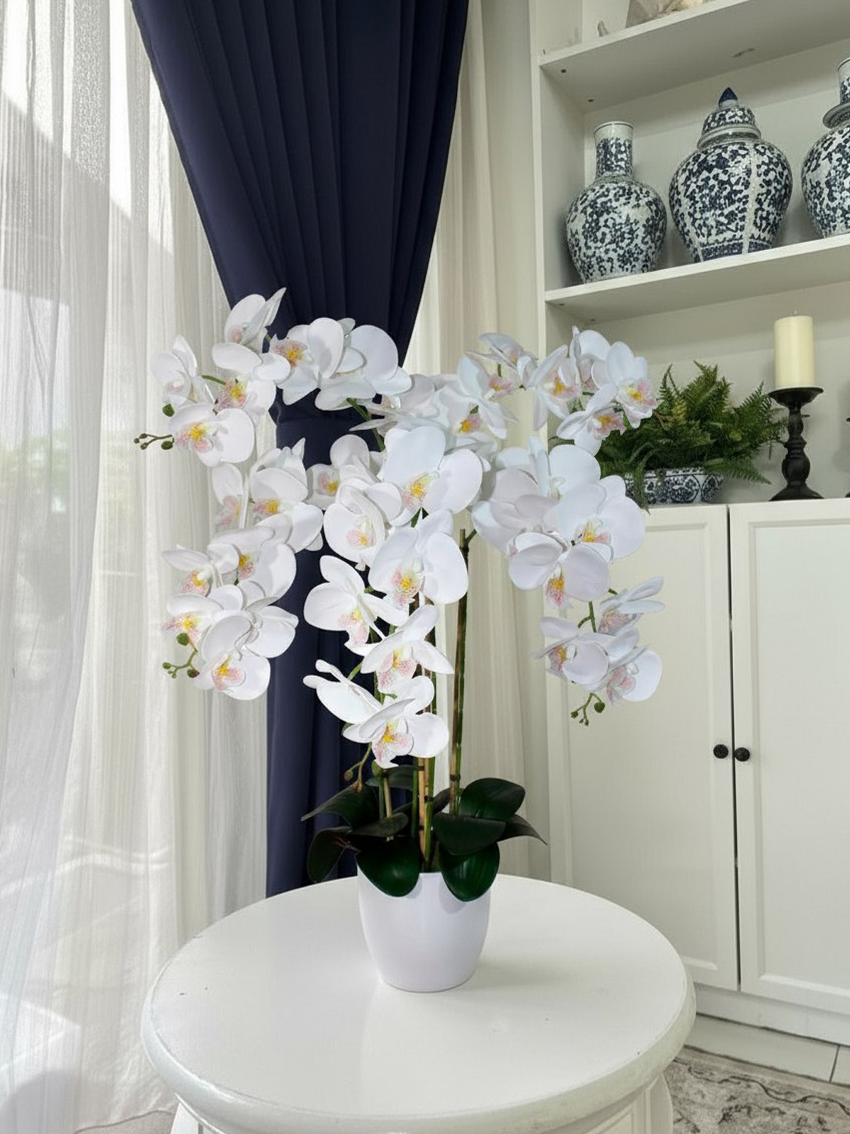 Высота орхидей составляет 75 см, что делает их идеальным выбором для создания впечатляющего акцента в любом помещении, особенно в гостиной на столе, в спальне на окне или на подоконнике, в офисе на ресепшн. Кроме того, они могут быть использованы для создания фотозон на свадьбу или прекрасно дополнять обстановку в частных домах, квартирах, ресторанах и школах.